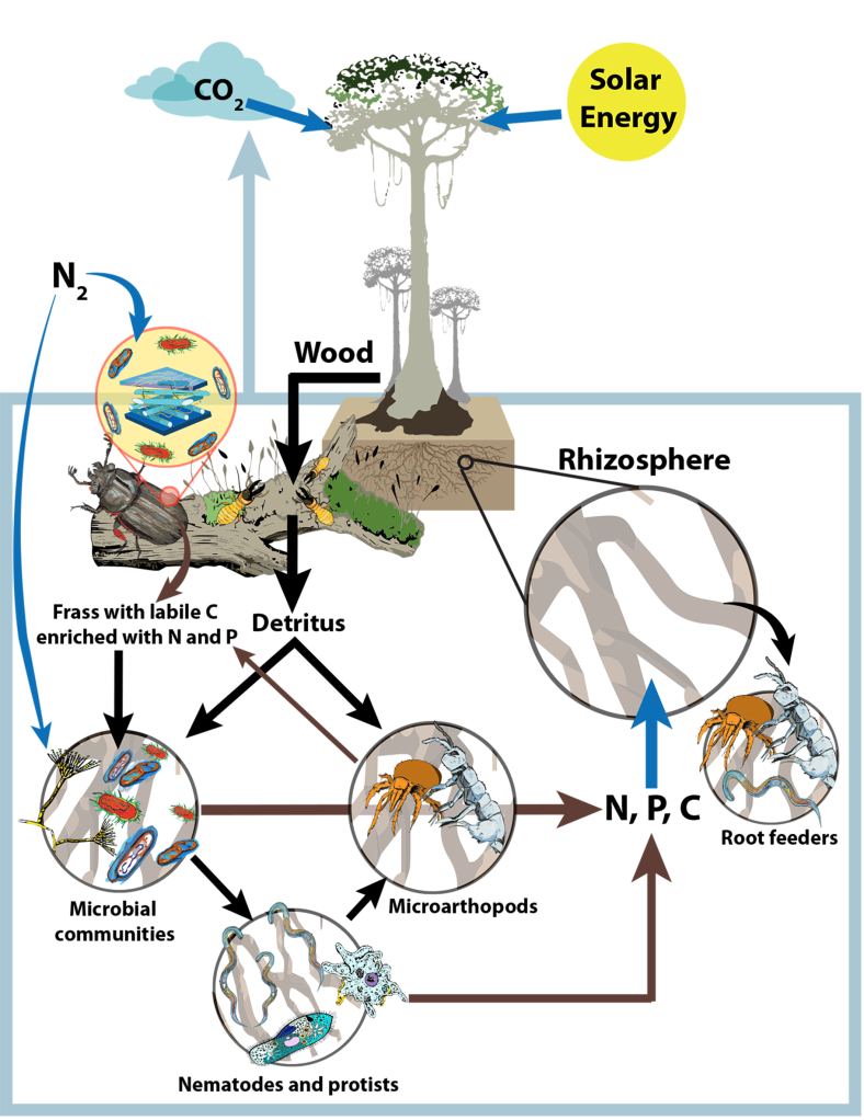 In all terrestrial ecosystems, numerous populations of organisms such as protists, nematodes, and arthropods interact with the soil’s free-living and plant-associated microbes, defining biogeochemical and nutrient cycling processes. To predict the responses of C and nutrient cycling to environmental change, it is important to recognize that these environmental processes are the result of the interactions of multiple groups of organisms that in concert shape an ecosystem and its processes.